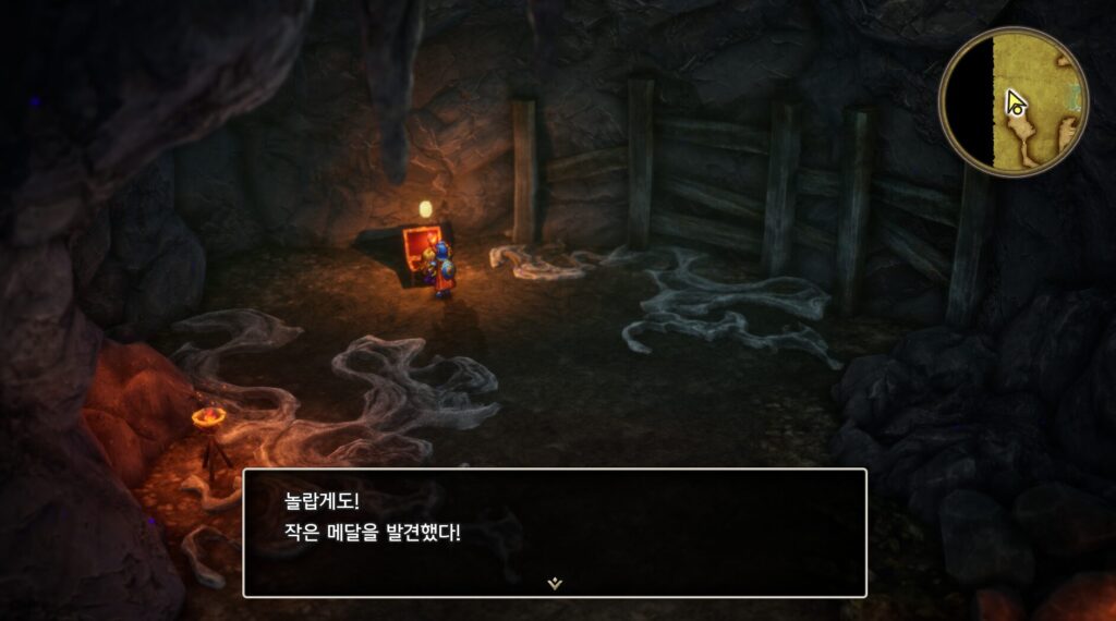 1층 좌측방 상자 – 작은메달 (길게눌러 바깥쪽으로 루라 또는 드워프동굴로 루라후 리레미트로 던전밖으로 나간후 다시진입)