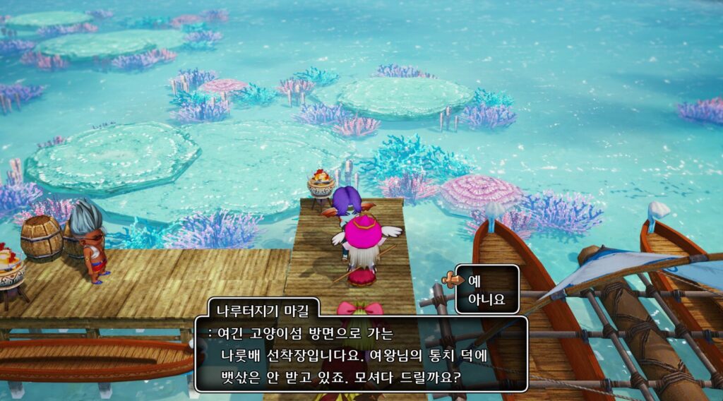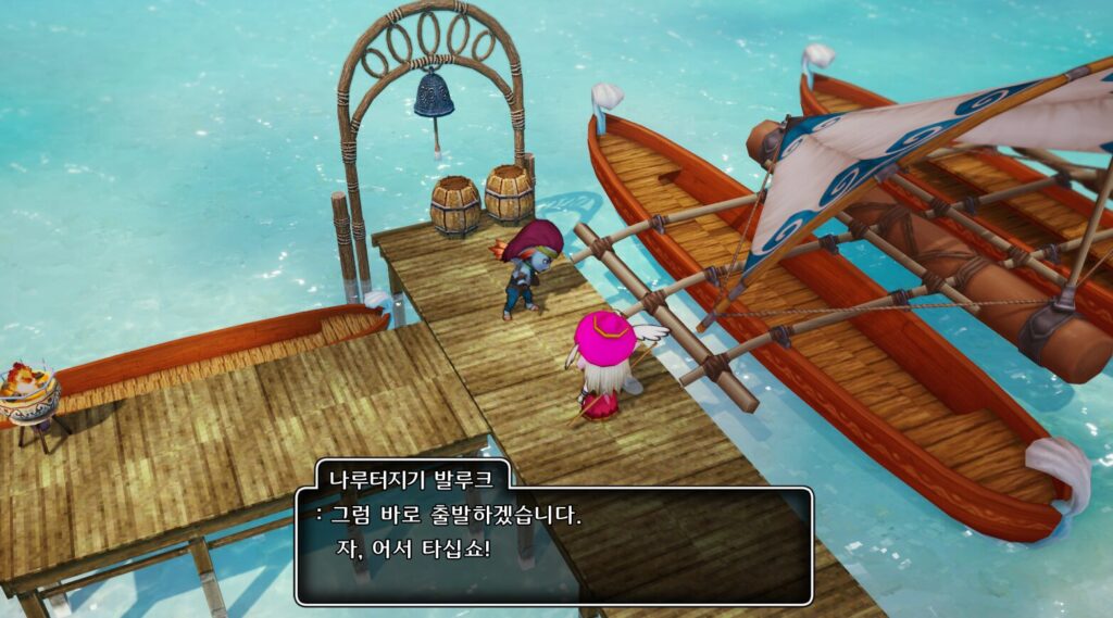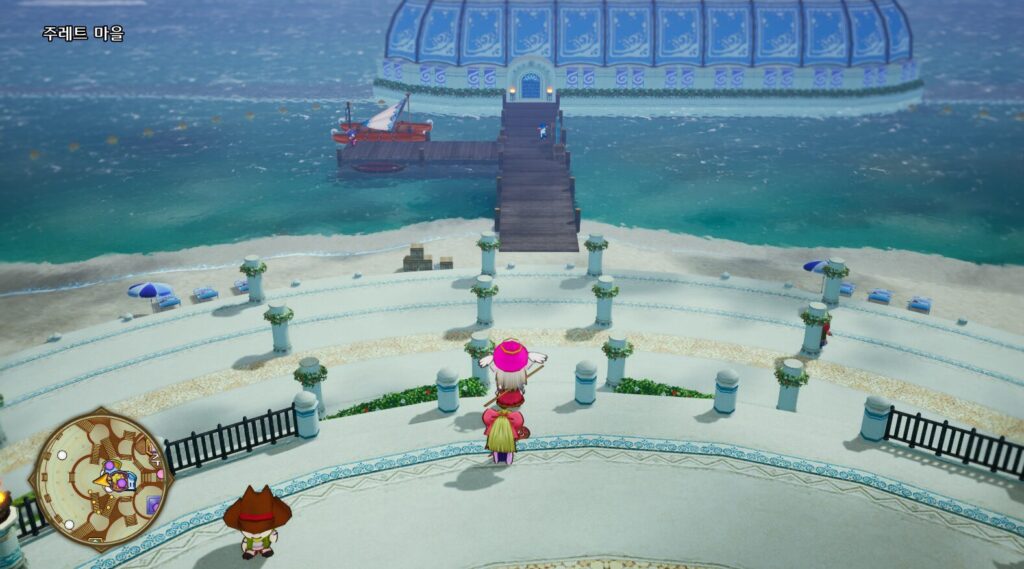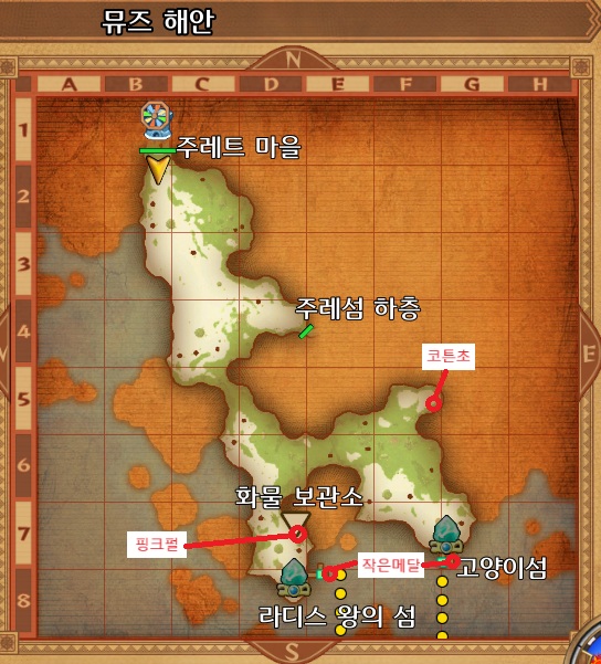 마을 남쪽출구로 나가 뮤즈해안 D8의 라디스왕의섬 방향 선착장까지 이동