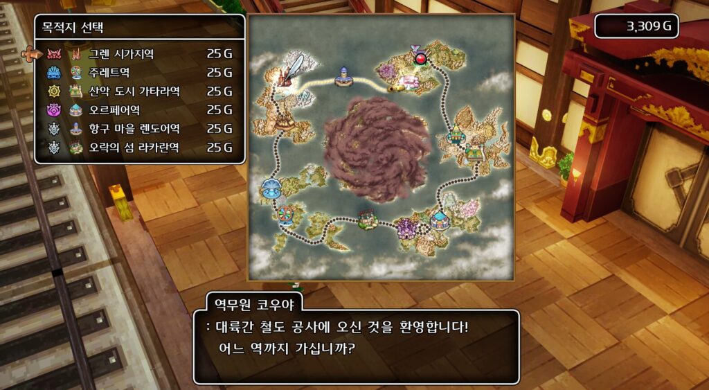 두번째 마을까지는 걸어서 가고 두번째마을을 클리어하면 철도가 개방되는데 그때부터는 자유여행이된다
