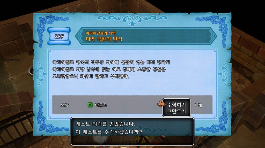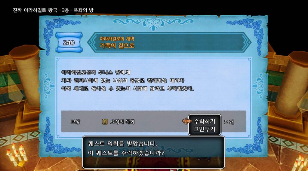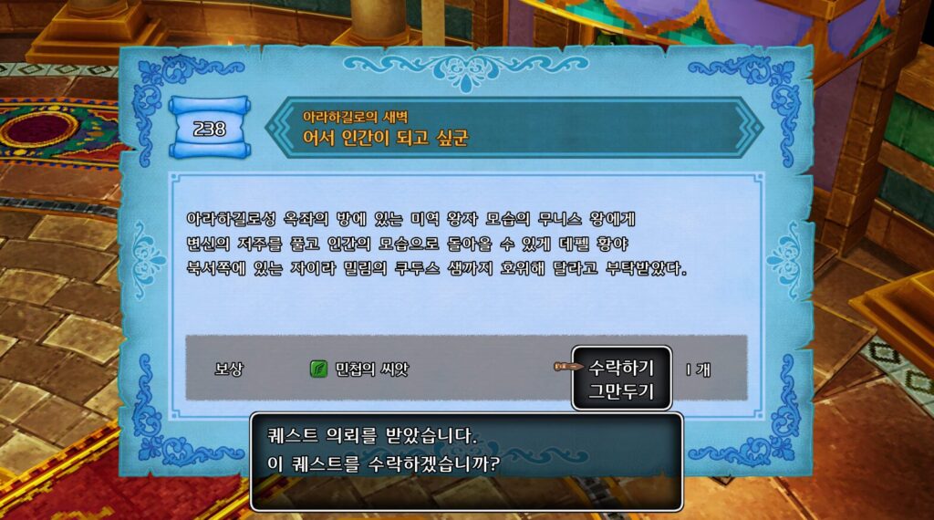 다시 왕좌로 향해 왕과대화하면 아라하길로 마지막퀘스트를 받을수있다