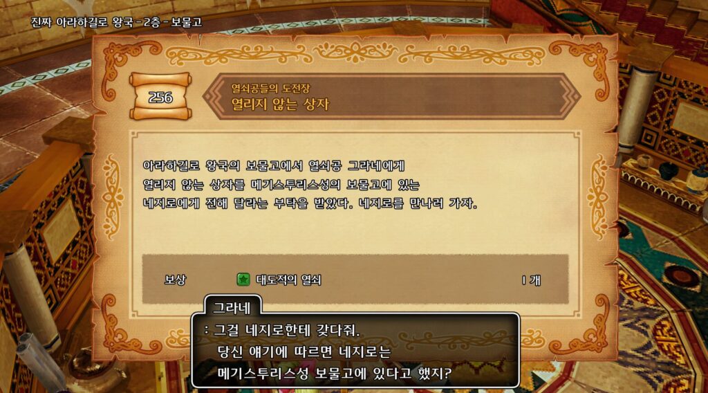 진짜 아리하길로왕국 보물고의 그라네와 대화하면 대도적의열쇠를 받고 퀘스트를 완료할수있다