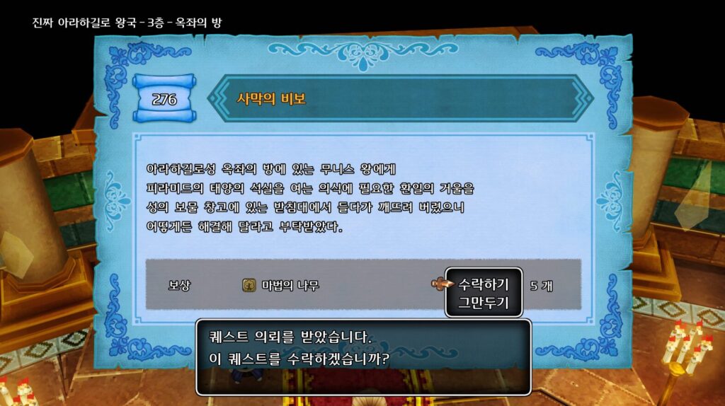 이후 아라하길로 왕국 왕좌로 향해 보상을받고 퀘스트를 완료하자