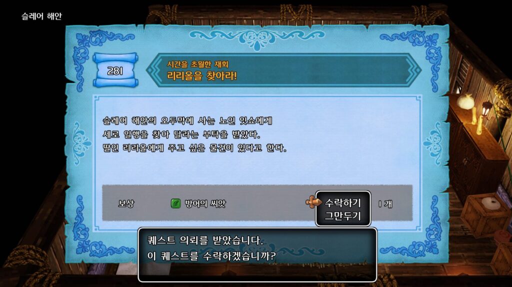 잇쇼에게 다시말을 걸면 다음 퀘스트를 받을수있다. 주인공의형제와 리리올을 찾아야한다