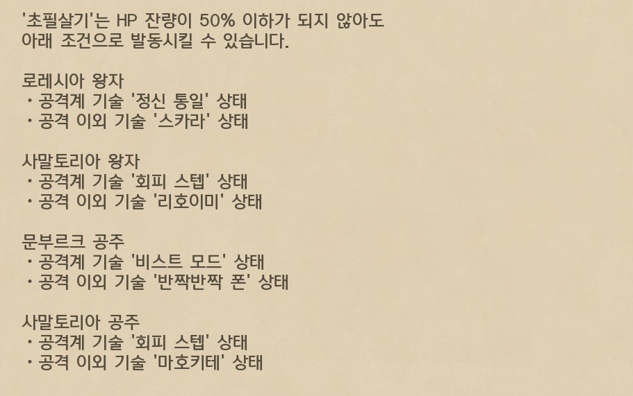 이번작은 캐릭마다 조건이 다르다. 그렇기에 HP50%이하를 포함 캐릭마다 3가지 조건하에