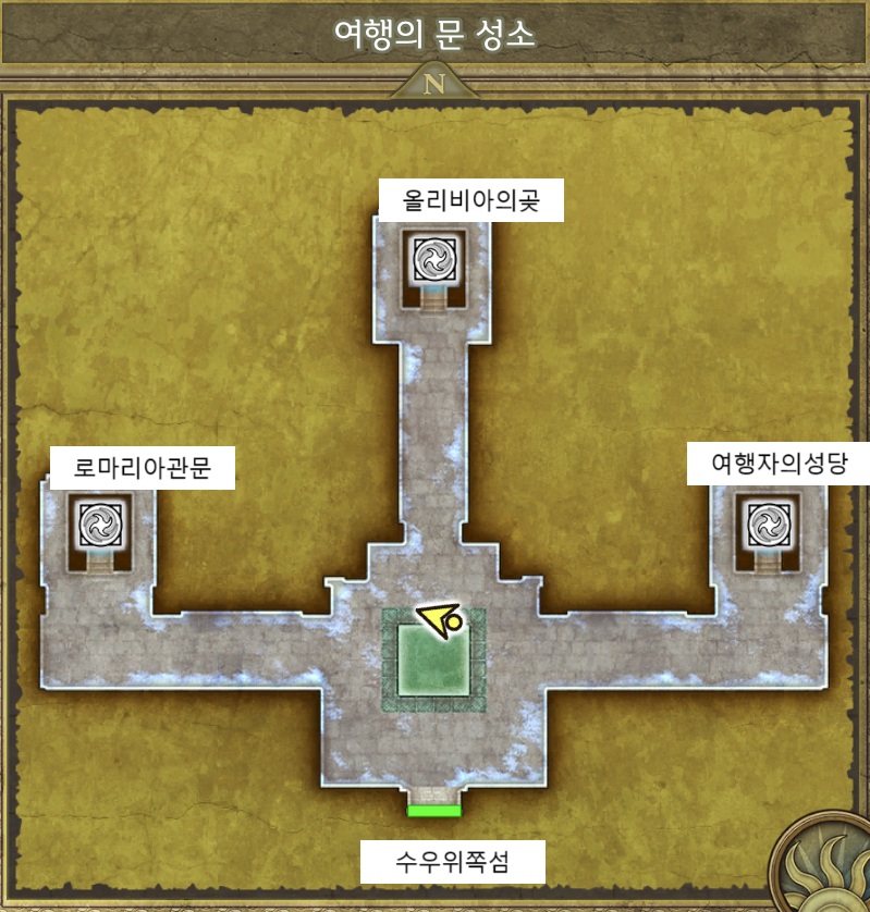 [오른쪽]여행자의성당 – 출구로 나가면 – 사만오사 스토리 라의거울 과 보스트롤 | 워프존 ->올리비아곶