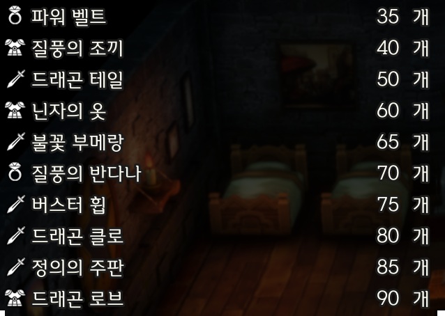| 35 | 인텔리 안경 | 85 | 드래곤로브 |